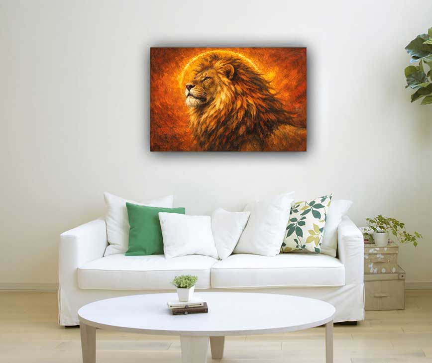 This striking majestic lion portrait canvas wall art symbolizes authority, dominance, and unshakable confidence. The lion, known as the king of the jungle, represents leadership, courage, and fearless decision-making. Its intense gaze and powerful presence inspire strength and self-belief, making this artwork on canvas ideal for offices, leadership spaces, and living areas. As a vastu painting, it enhances confidence, strengthens authority, and supports success by promoting bold action and clear vision.