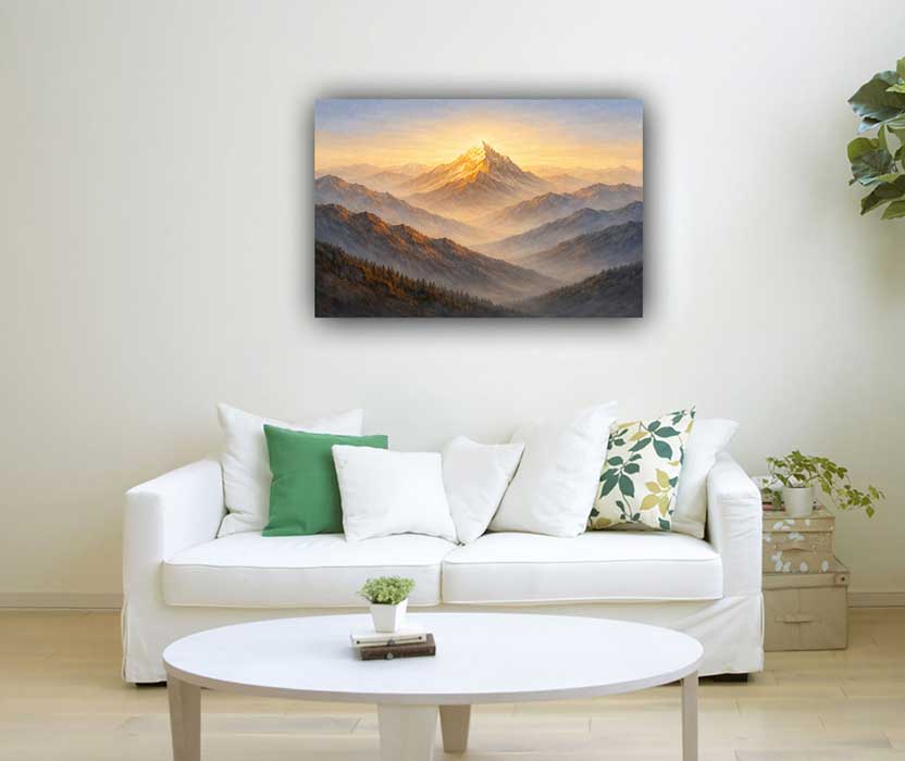 This inspiring painting of a mountain peak illuminated by radiant sunlight symbolizes success, profits, and long-term financial gains—especially when placed in the west direction as per vastu. The towering mountain represents strength, stability, and achievement, while the sunlight signifies rewards, clarity, and positive outcomes. The west direction enhances returns, recognition, and results from efforts, making this artwork ideal for offices, workspaces, or living areas. As a vastu painting, it helps attract financial gains, support steady growth, and ensure long-term success.