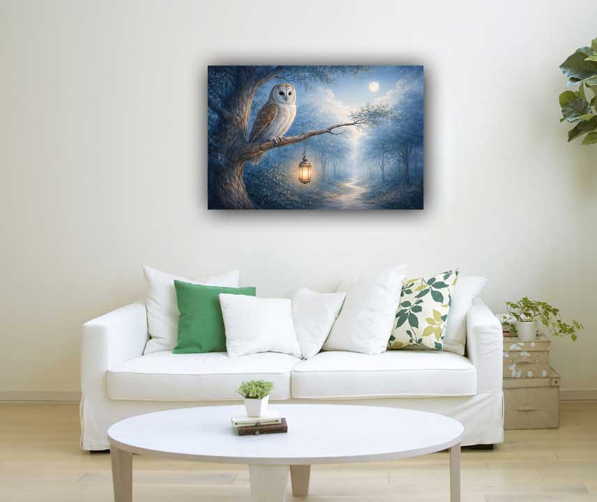 This powerful artwork on canvas features an owl perched on a branch at night, symbolizing wisdom, intuition, and guidance. Ideal for study rooms and offices, this modern canvas print enhances insight and decision-making. As a vastu painting, it strengthens advisory support and clarity.