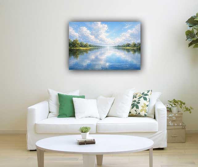 Tranquil lake wall art promoting peace, clarity, and spiritual balance.