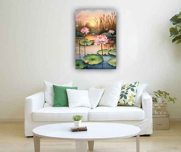 Lotus paintings hold profound significance in both Vastu Shastra and Feng Shui, symbolizing purity, enlightenment, and spiritual growth. In Vastu Shastra, the lotus is associated with purity and positivity, making it an auspicious symbol to incorporate into your home or workspace. According to Vastu principles, lotus paintings can be placed in areas that require a boost of positive energy, such as the entrance foyer or meditation room. In Feng Shui, the lotus is revered for its ability to attract good fortune and harmonize the energy of a space. Lotus paintings are often used to enhance the flow of chi, or life force energy, in the home or office. Placing lotus paintings in areas associated with wealth and abundance, such as the wealth corner or near a water feature, can amplify their beneficial effects. Overall, lotus paintings serve as powerful reminders of the beauty and purity that can be found amidst life's challenges, bringing a sense of serenity and renewal to any environment.