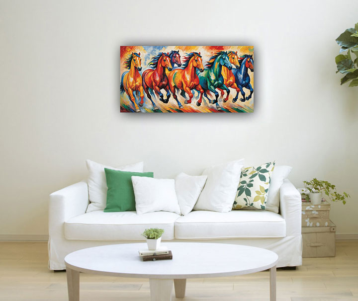 The painting features seven majestic horses galloping together, symbolizing a powerful and harmonious energy flow that propels one towards fame, recognition, and success. The south direction is associated with fame, recognition, and success. Placing the painting in the south area of a room or space aligns with Vastu principles, as it harnesses the positive energy associated with these attributes.