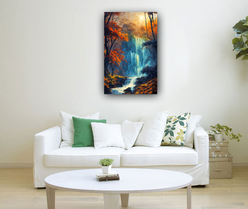 In Vastu Shastra, an ancient Indian architectural philosophy, waterfalls symbolize abundance, prosperity, and the flow of positive energy. Placing a waterfall painting in the north or northeast direction of a home or office is believed to attract wealth and financial success. The flowing water in the painting represents the constant flow of opportunities and resources into one's life.