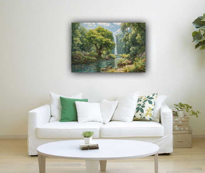 In Vastu Shastra, an ancient Indian architectural philosophy, waterfalls symbolize abundance, prosperity, and the flow of positive energy. Placing a waterfall painting in the north or northeast direction of a home or office is believed to attract wealth and financial success. The flowing water in the painting represents the constant flow of opportunities and resources into one's life.