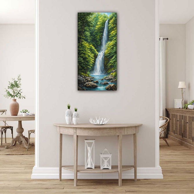 In Vastu Shastra, an ancient Indian architectural philosophy, waterfalls symbolize abundance, prosperity, and the flow of positive energy. Placing a waterfall painting in the north or northeast direction of a home or office is believed to attract wealth and financial success. The flowing water in the painting represents the constant flow of opportunities and resources into one's life.