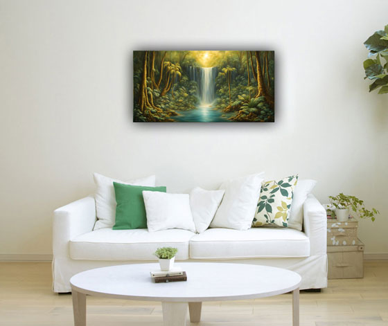 In Vastu Shastra, an ancient Indian architectural philosophy, waterfalls symbolize abundance, prosperity, and the flow of positive energy. Placing a waterfall painting in the north or northeast direction of a home or office is believed to attract wealth and financial success. The flowing water in the painting represents the constant flow of opportunities and resources into one's life.
