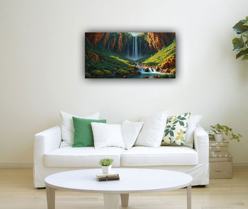 In Vastu Shastra, an ancient Indian architectural philosophy, waterfalls symbolize abundance, prosperity, and the flow of positive energy. Placing a waterfall painting in the north or northeast direction of a home or office is believed to attract wealth and financial success. The flowing water in the painting represents the constant flow of opportunities and resources into one's life.