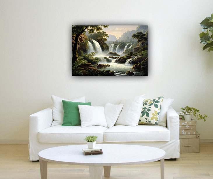 In Vastu Shastra, an ancient Indian architectural philosophy, waterfalls symbolize abundance, prosperity, and the flow of positive energy. Placing a waterfall painting in the north or northeast direction of a home or office is believed to attract wealth and financial success. The flowing water in the painting represents the constant flow of opportunities and resources into one's life.
