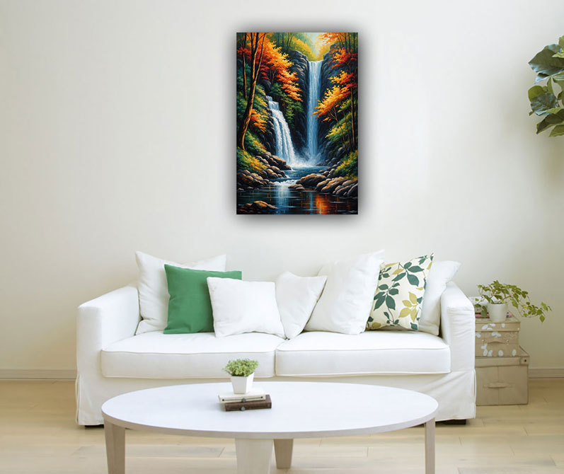 In Vastu Shastra, an ancient Indian architectural philosophy, waterfalls symbolize abundance, prosperity, and the flow of positive energy. Placing a waterfall painting in the north or northeast direction of a home or office is believed to attract wealth and financial success. The flowing water in the painting represents the constant flow of opportunities and resources into one's life.