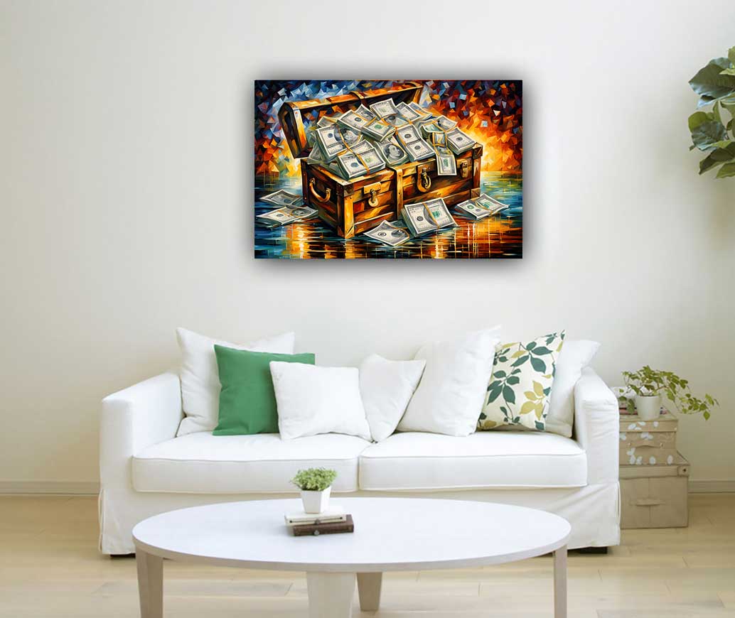 Painting centered around overflowing treasure chests, each brimming with riches beyond imagination. Picture these chests surrounded by symbols of abundance, such as stacks of Money.