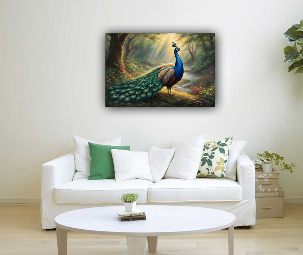Peacock paintings hold significant importance in Vastu and Feng Shui. In Vastu, a peacock painting is believed to attract positive energy, bringing prosperity, harmony, and peace to the home. The vibrant colors and regal presence of the peacock symbolize beauty and grace, enhancing the aesthetic appeal and uplifting the mood. In Feng Shui, the peacock represents dignity, love, and prosperity. Placing a peacock painting in the living room or entrance can invite auspicious energy, fostering a balanced and harmonious environment.