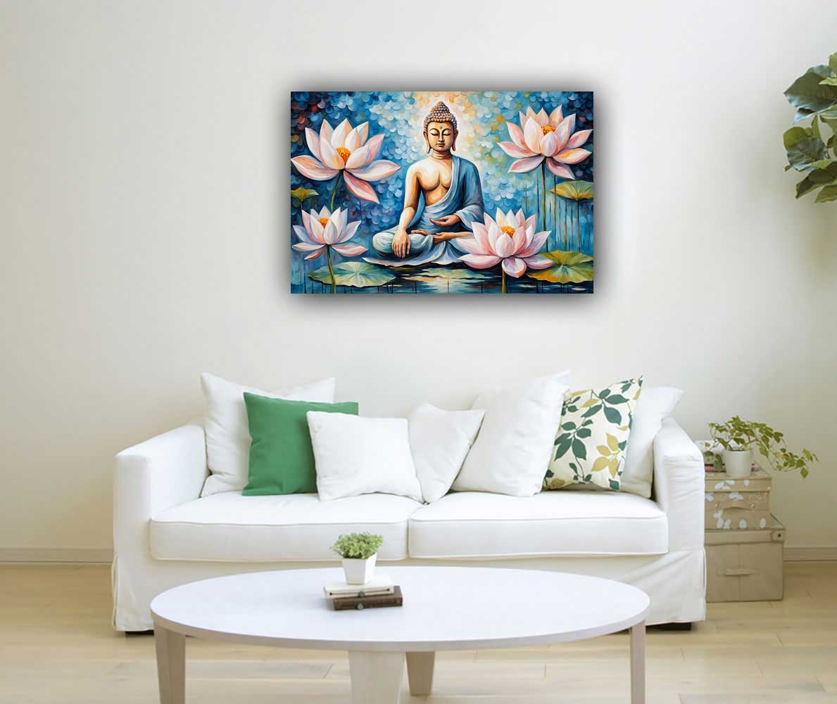 Buddha Meditating Painting with Lotus Flower: This inspiring painting features Buddha meditating amidst blooming lotus flowers, symbolizing health, immunity, and mental clarity. The lotus represents purity and spiritual enlightenment, while Buddha’s serene presence enhances tranquility and focus. According to Vastu and Feng Shui principles, placing this painting in the North-North East (NNE) or North East (NE) directions is ideal. The NNE direction supports health and personal growth, while the NE direction promotes mental clarity and spiritual insight. This painting is perfect for creating a peaceful environment that nurtures both physical well-being and mental clarity. Explore beautiful collection of Buddha Painting Click Here
