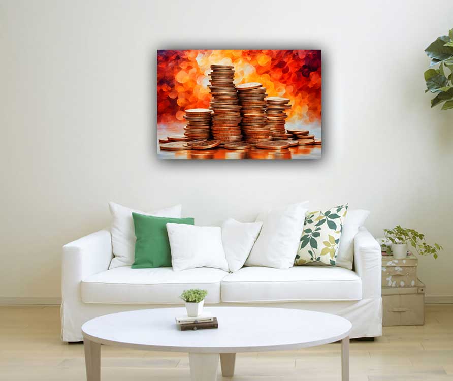 Positioning this Stack of Coins painting in the South East corner of your home or office aligns with Vastu principles to boost financial abundance and liquidity. This strategic placement supports the steady flow of resources, fostering a prosperous and financially stable environment. Explore beautiful collection of Symbol of Abundance Click Here
