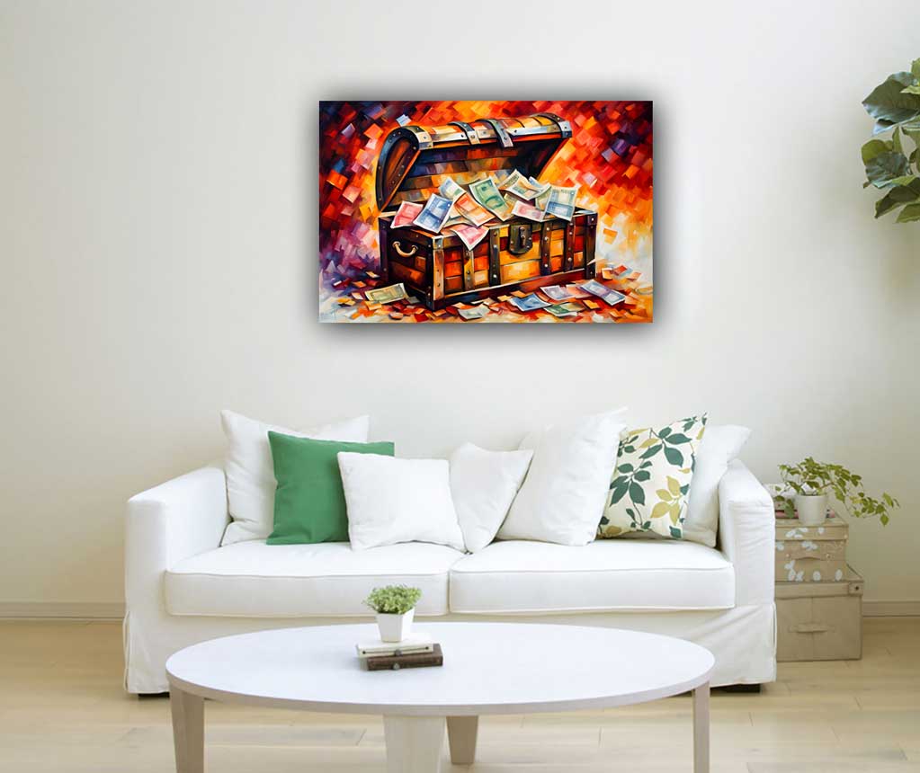 South East Direction for Cash and Liquidity: The South East, represented by red, is crucial for financial stability. A painting of a Money Chest placed here symbolizes cash and liquidity, enhancing wealth and attracting financial prosperity. Explore beautiful collection of Symbol of Abundance Click Here