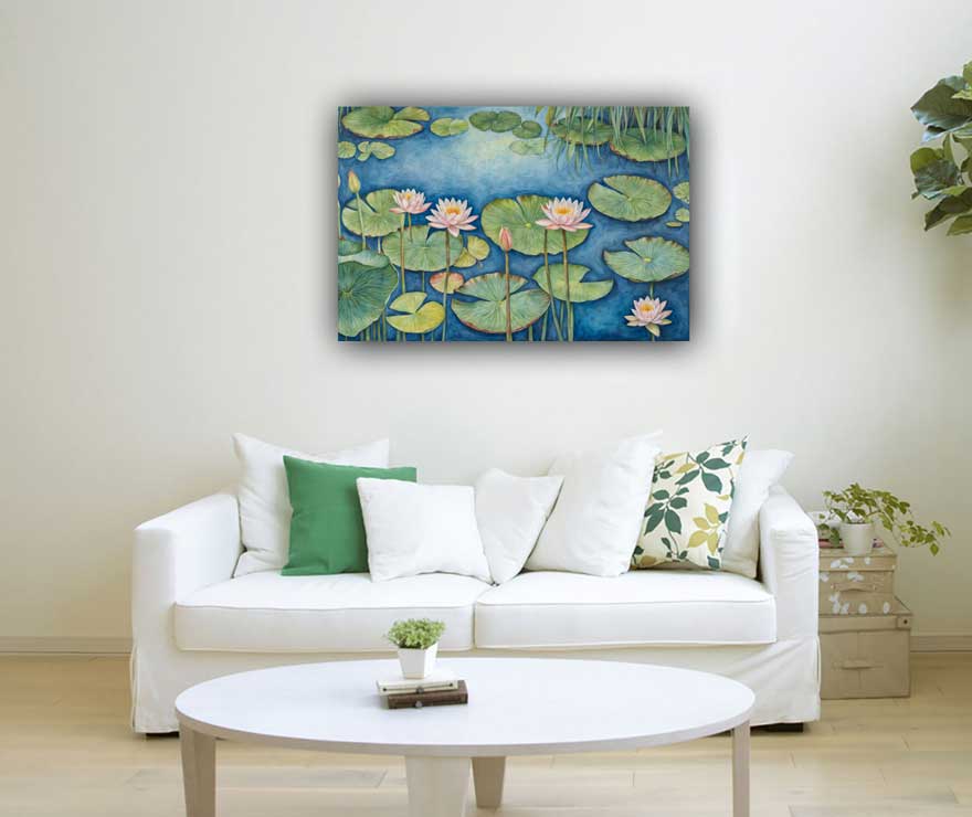 In Vastu Shastra, a painting of water lilies holds special significance as it represents the water element, which is closely tied to emotional balance, serenity, and spiritual growth. Water lilies symbolize purity, enlightenment, and renewal, as they bloom in water, rising above murky conditions to blossom beautifully.