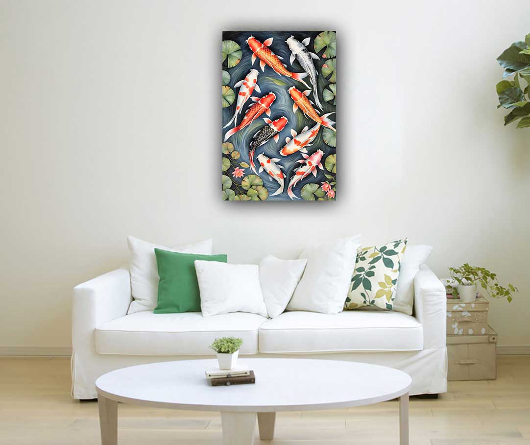 In Feng Shui, a Koi Fish painting symbolizes wealth, success, and perseverance. Known for its ability to swim upstream against strong currents, the Koi Fish represents overcoming hurdles in life, career, and business. Its resilience and determination make it a powerful emblem of strength and the ability to face challenges head-on.
