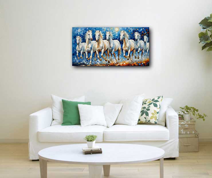 A painting of 7 running white horses with a blue background is a powerful and auspicious symbol in Vastu Shastra. When placed on the north wall of your home or office, it can significantly enhance financial growth, career success, and abundance.
