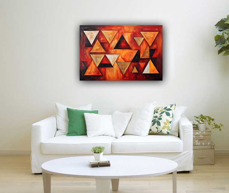 Elevate your space with an abstract geometric triangular shapes painting, symbolizing fame and recognition in the South direction. Designed with Vastu principles in mind, this artwork promotes career success and public acknowledgment.