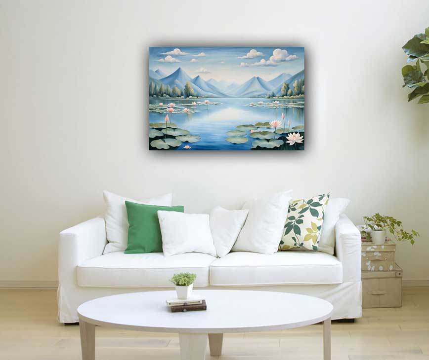 Enhance health, peace, and well-being with this serene Lake with Blooming Lotus Flowers artwork, specially designed for the Northeast direction as per Vastu Shastra. The calm waters of the lake represent emotional stability, while the blooming lotus symbolizes purity, renewal, and spiritual growth. Placing this painting in the Northeast zone helps attract positive energy, wisdom, and a balanced state of mind, fostering an environment of healing and inner harmony.