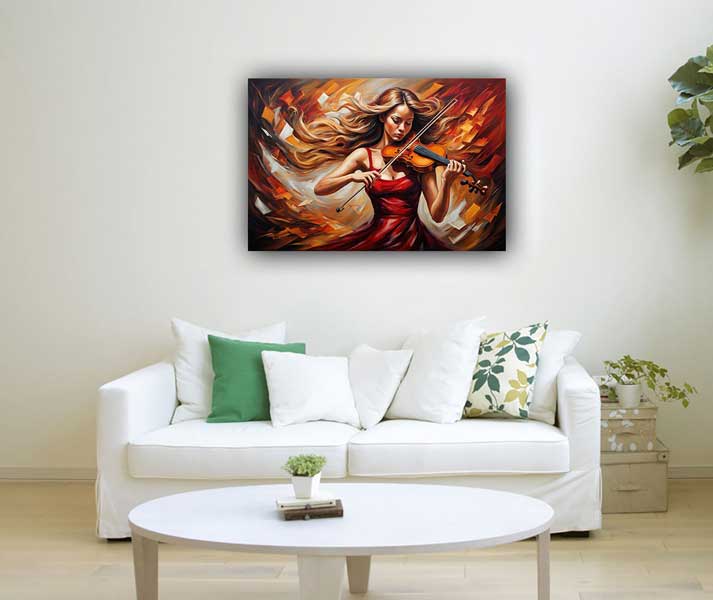 Enhance your space with this passionate violinist artwork in red and yellow, symbolizing enthusiasm and creativity. Perfect for the South direction as per Vastu, it brings fame, recognition, and vitality.