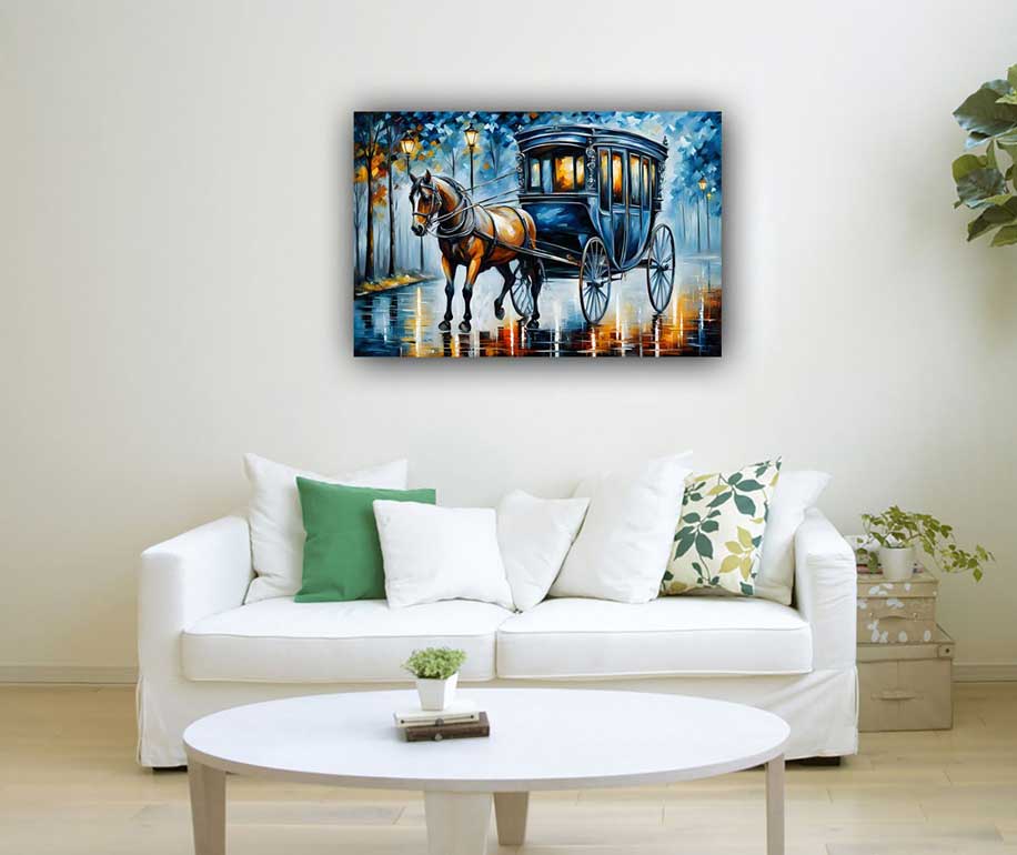 This stunning painting of a carriage being pulled by a strong horse symbolizes progress, expansion, and the smooth journey of life. Placed in the Northwest direction as per Vastu Shastra, this artwork is believed to enhance travel opportunities, business expansion, and success in new ventures. The horse, a symbol of strength and speed, coupled with the carriage, represents forward movement and success in your endeavors. This piece is perfect for those seeking to enhance their life's journey with greater momentum and growth.