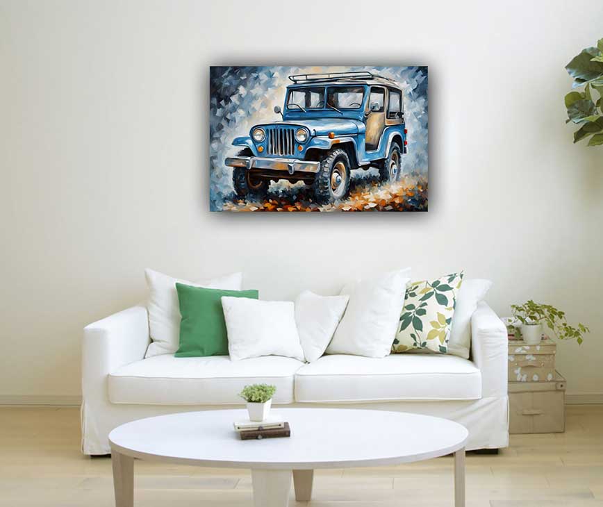 This stunning vintage jeep artwork is perfect for the Northwest direction of your space, representing adventure, exploration, and expansion opportunities. In Vastu Shastra, the Northwest is associated with travel and new ventures, and this artwork captures the essence of moving forward and embracing fresh opportunities. The jeep, a symbol of resilience and courage, evokes the spirit of exploration, making it a powerful addition to any space focused on growth, ambition, and success. Ideal for entrepreneurs, adventurers, or anyone seeking to expand their horizons.