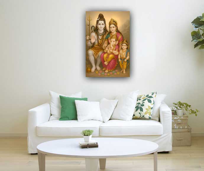 Lord Shiva Family Painting This divine artwork features Lord Shiva, Goddess Parvati, Lord Ganesha, and Lord Kartikeya—symbolizing unity, love, and strength. It brings peace, protection, and harmony to any home. Placing it in the Southwest direction as per Vastu Shastra strengthens family bonds and emotional stability. Perfect for living rooms or pooja spaces, it invites divine blessings and positive energy.