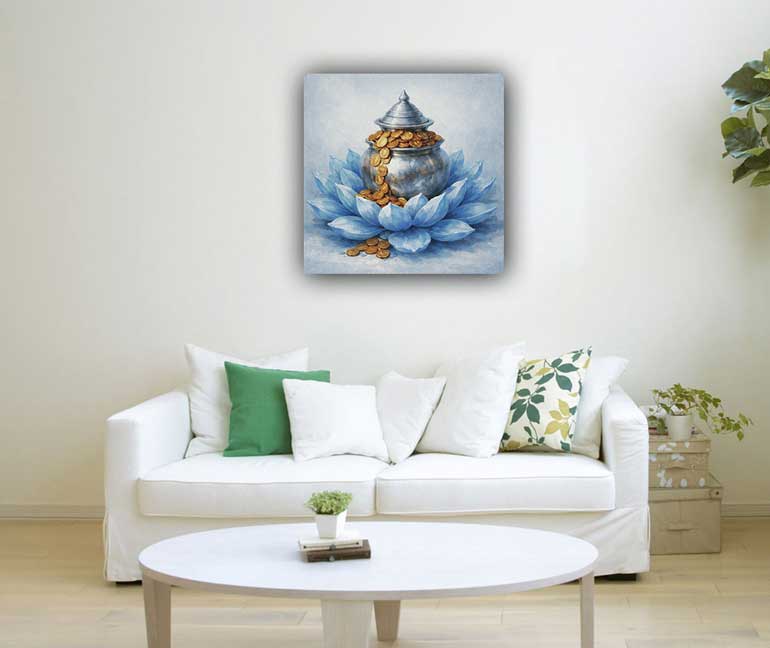 This auspicious painting of a silver kalash filled with coins represents wealth attraction, purity, and positive energy. The kalash symbolizes prosperity and शुभता, while the coins signify financial growth and abundance. Ideal for entrances, pooja rooms, or living spaces, this artwork enhances spiritual and financial harmony. As a vastu painting, it helps attract wealth, remove negativity, and ensure continuous prosperity. Perfect as wall art, canvas wall art, or modern canvas prints, it adds both cultural significance and elegance to your décor.