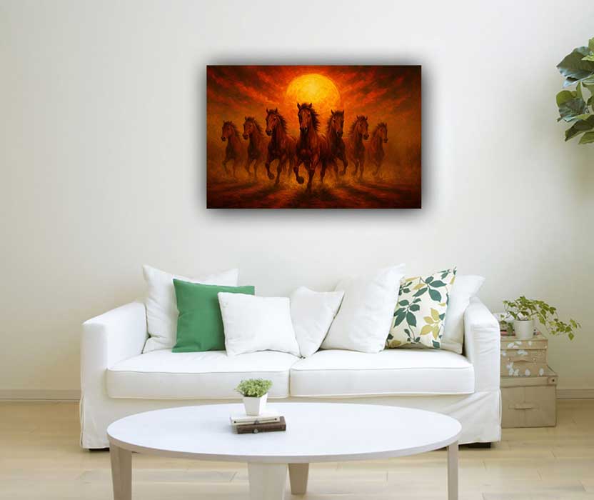 This vibrant painting captures seven horses running towards a glowing sun, symbolizing rising success, visibility, and achievement. The warm tones of orange and gold enhance motivation, energy, and positivity. In vastu, placing this artwork in the south direction boosts name, fame, and recognition while accelerating success. Ideal for professionals, influencers, and business owners looking to grow their presence and impact.