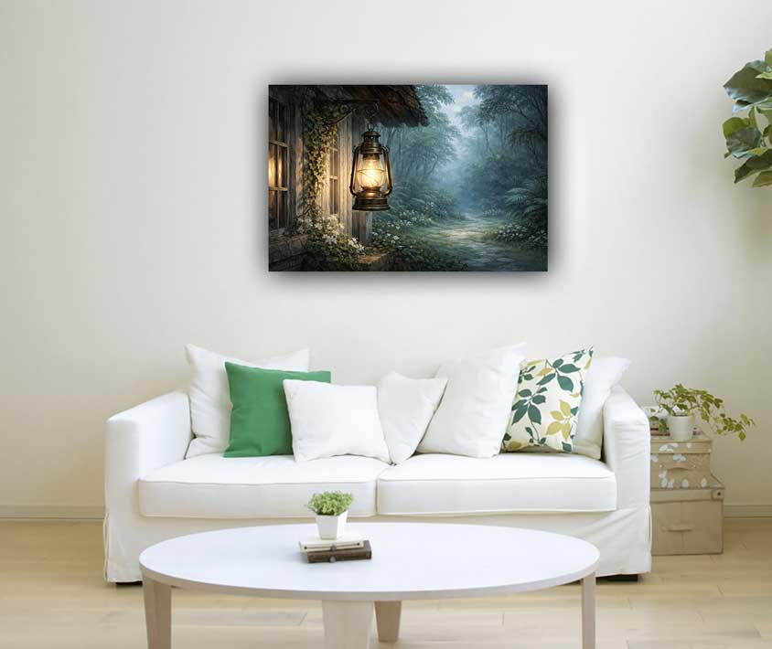 This warm glowing lantern artwork on canvas symbolizes guidance, hope, and clarity. Perfect vastu paintings for North-West to attract helpful people and right decisions.