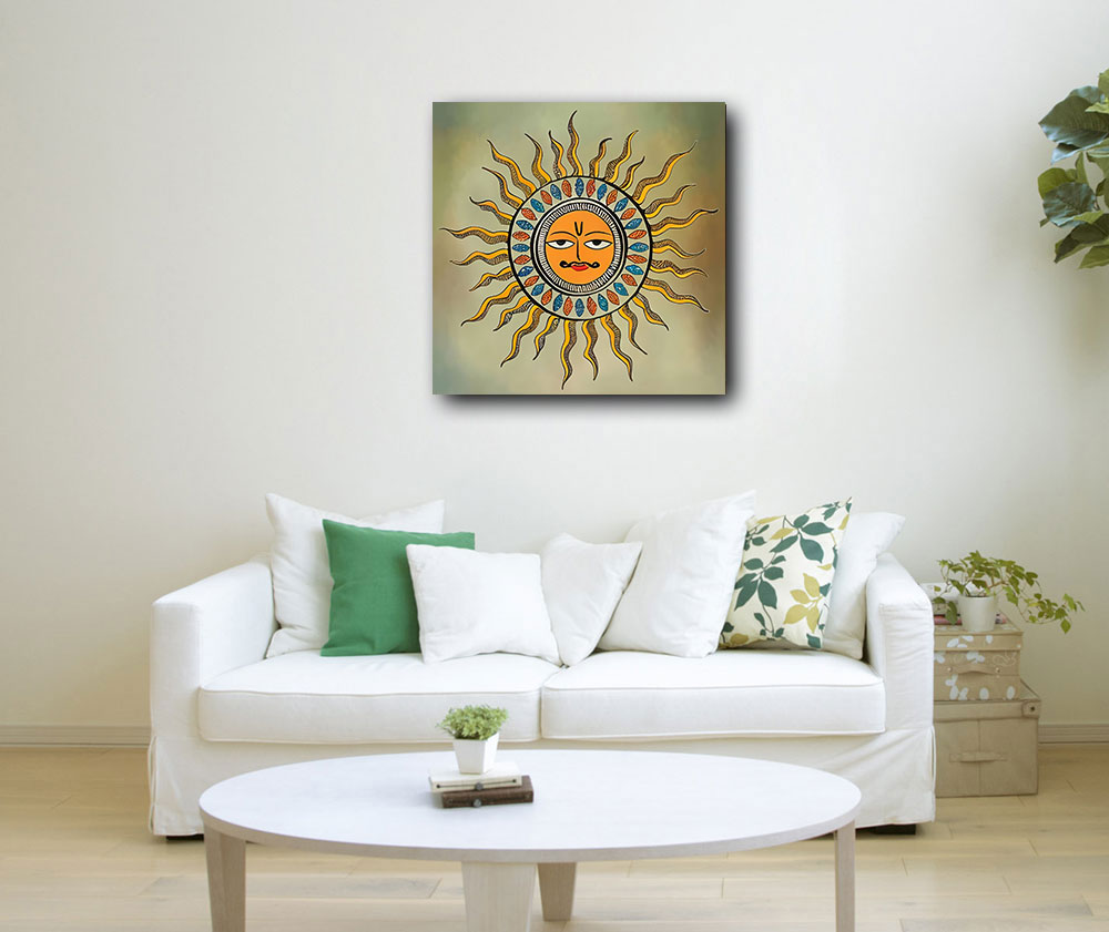 Lord Surya, also known as the Sun God, holds a significant place in Hindu mythology and is revered as the deity responsible for sustaining life on Earth.Surya is considered the source of light, energy, and life. He symbolizes vitality, power, and knowledge.the painting of Lord Surya captures his radiant and majestic presence, exuding a sense of warmth, power, and divinity. It serves as a visual tribute to the Sun God and his vital role in sustaining life on Earth.