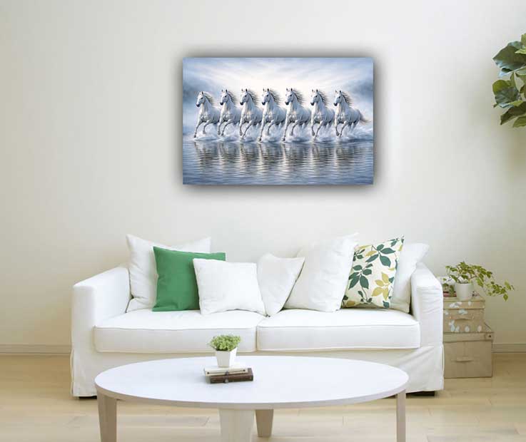 Seven White Horses Wall Art for North Direction is a classic and highly auspicious Vastu painting known to activate growth, progress, and professional opportunities. According to Vastu Shastra, the North direction governs career expansion, income flow, and life momentum—making this artwork ideal for offices, study rooms, and work-from-home spaces.The imagery of seven running white horses represents speed, discipline, confidence, and continuous forward movement. When placed in the North, this canvas painting is believed to remove stagnation, attract new opportunities, and support leadership growth.