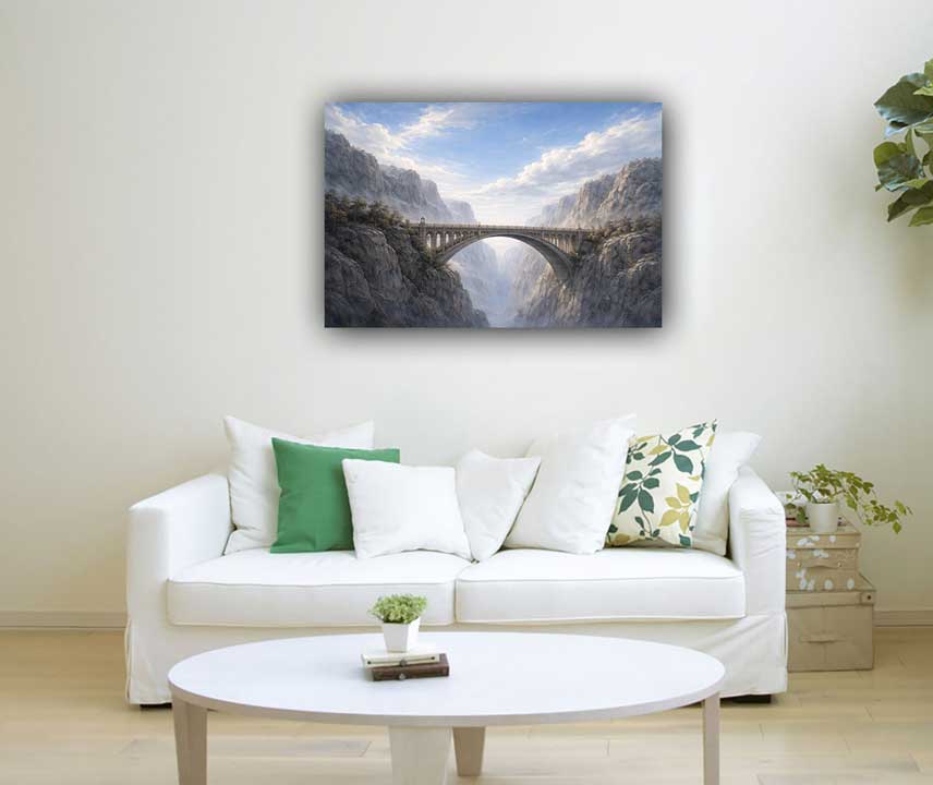 This impactful artwork on canvas features a bridge connecting two cliffs, symbolizing access, opportunity, and powerful connections. Ideal for offices, this modern canvas print enhances networking and success. As a vastu painting, it supports influential relationships.