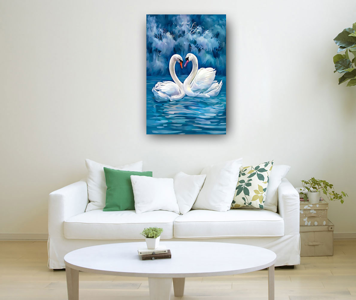 In Vastu Shastra, paintings depicting swans can be used to enhance the positive energy (prana) in a space. Placing a painting of swans in specific areas of the home or workplace is believed to attract positive vibrations and good fortune. Swans are often associated with the direction of the North, which is related to career and opportunities. Placing a swan painting in the North sector of a space can be considered auspicious in Vastu.
